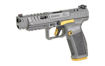 The Canik SFx Rival has a total length of 8.1 in., a height of 5.7 in., a 1.41 in. width, a 5 in. barrel, and an overall weight of 29.5 oz. With these specifications the Canik SFx Rival can compete in IDPA, IPSC, and USPSA without restrictions. The Canik Rival is available in Canik Rival Grey with Cerakoted gold accents and in an all-black configuration called the Canik SFx Rival Dark Side. With adjustable fiber optic sights, a lightened 90 Degree diamond cut aluminum flat trigger, reversible magazine releases and sizes, ambidextrous slide release, aggressively serrated and ported slide, 1913 Picatinny rail, external mag-well, 3 grip back strap sizes, double undercut trigger guard, ergonomically redesigned beavertail, aggressive grip texturing, and a completely modular setup, the SFx Rival is ready to win right out of the box!