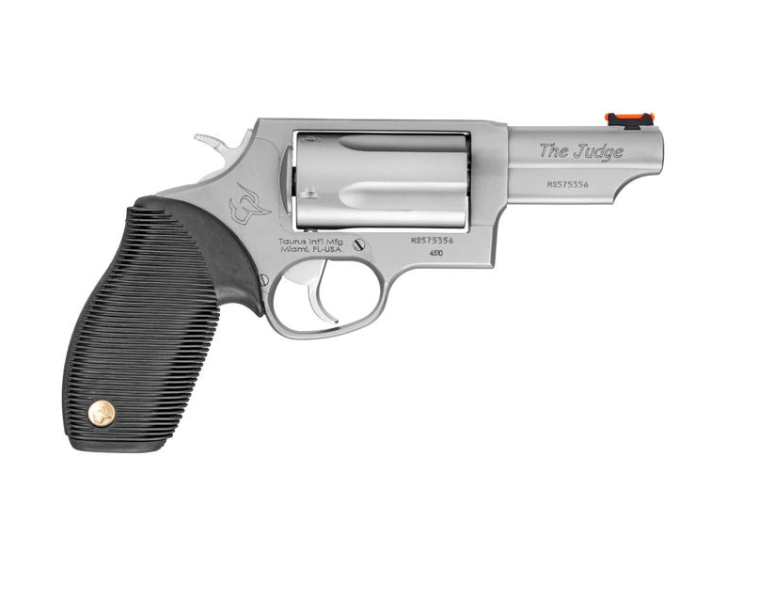 The Taurus Judge is named for the many judges who carry it into the courtroom for their protection, and it is capable of chambering both 410 gauge with 2-1/2" shotshell and the 45 Colt. This combo is ideal for short distances where most altercations occur and for longer distances with the 45 Colt ammo. The Taurus Judge is fully customized with fixed rear sights, fiber optic front sights, and finger grooved rubber grip. The safety features on this model include the Taurus Security System and a transfer bar. This model has a stainless steel metal finish and 3" barrel.